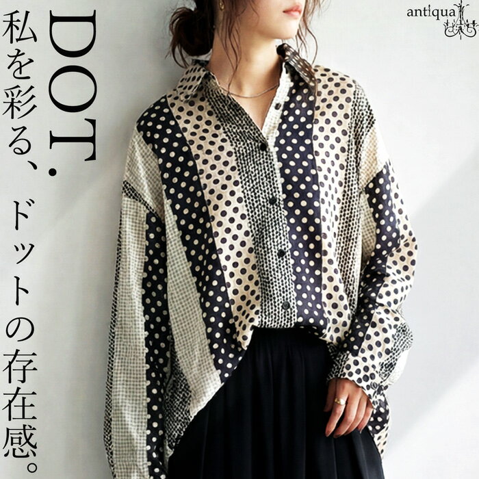 トップス ブラウス ドット 柄 水玉 柄シャツ 前開き モノトーン 綿 コットン 大きめサイズ ゆったり 大人可愛い ナチュラル カジュアル 体型カバー 羽織り オーバーサイズ