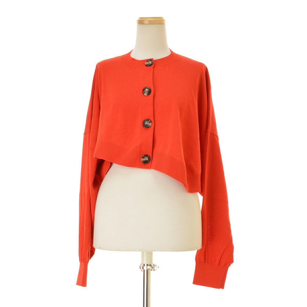 ニットカーディガン 裾フリル ボリュームフリル 薔薇ボタン ショート丈 クルーネック フェミニン 長袖